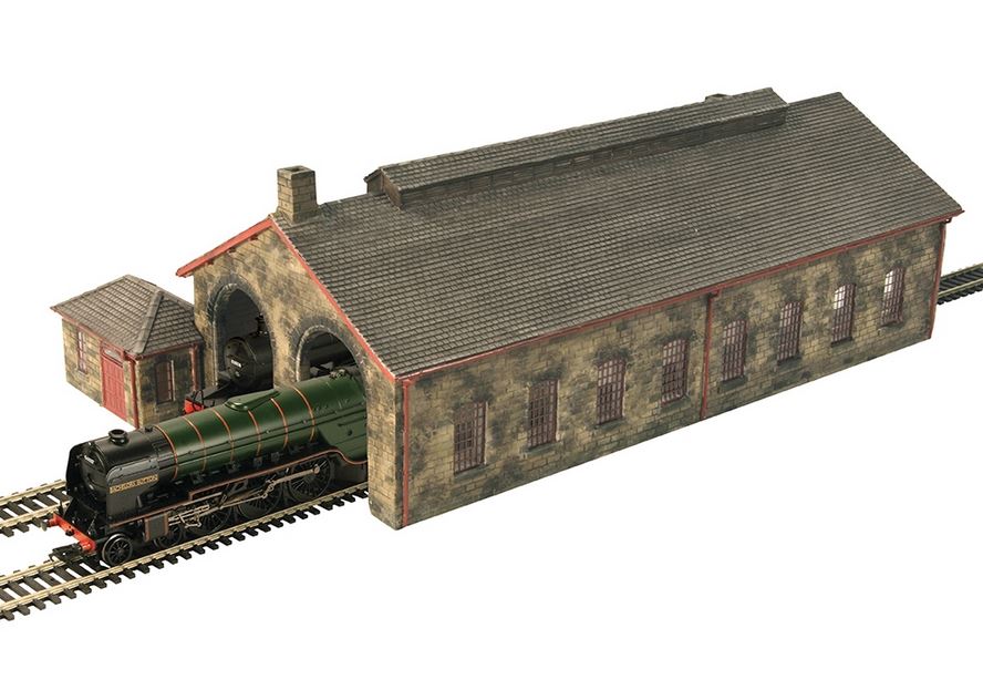 This imposing stone-built engine shed oozes atmosphere and is an ideal addition to any steam-era depot scene. Complete with details such as etched window frames, gutters and downpipes which are painted red, and with a weathered finish typical of a building used to house steam locomotives, this Scenecraft model will add instant impact to any layout or diorama. The model is supplied complete with a shed office which fits snugly against the corner of the shed.