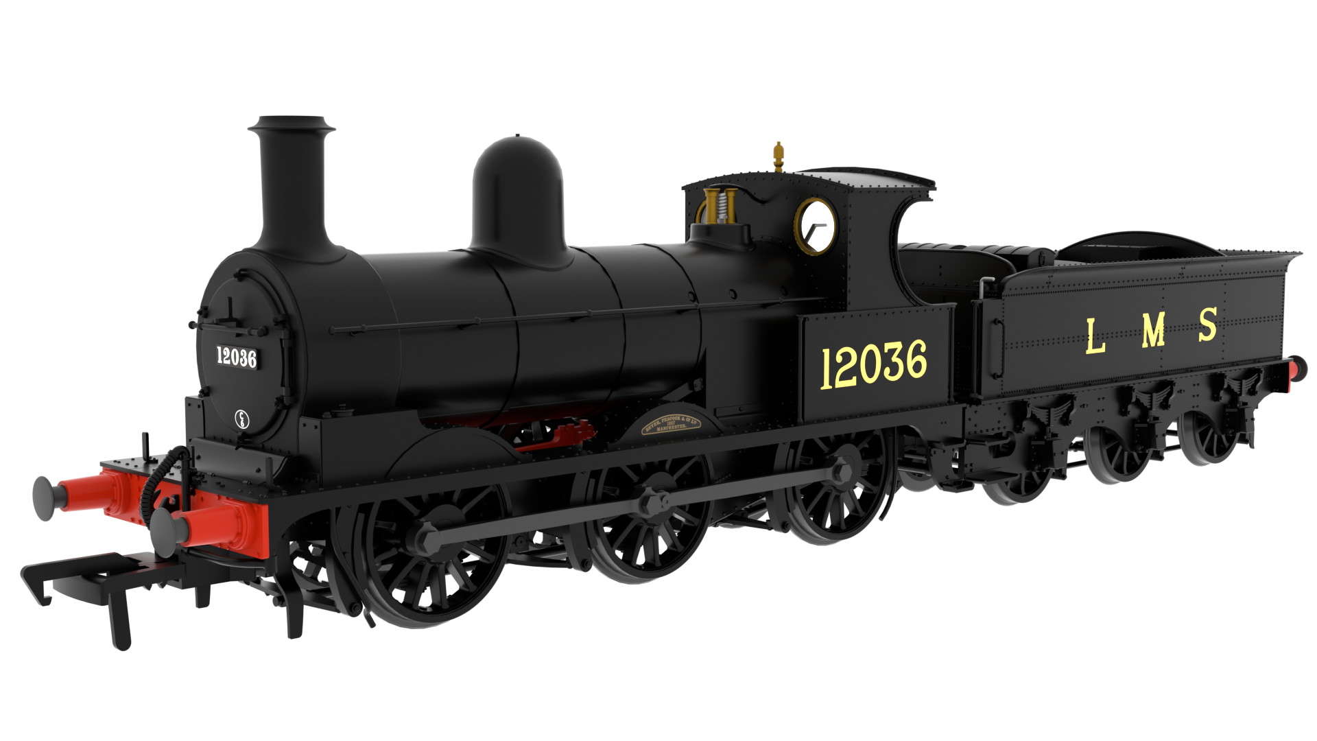 Lancashire & Yorkshire Railway Class 25 No. 12036 LMS Livery (cabside number) LMS Style Smokebox Door 3 Piece Boiler Handrail Ramsbottom Safety Valves Coreless motor with flywheel 21 pin decoder socket in tender Large tender mounted speaker MoPower stay-alive fitted. Plunger loco pickups Tender wheel bearing pickups Dynamic firebox flicker NEM pockets front and rear Suitable for operation on 2nd radius curves (438mm or greater)
