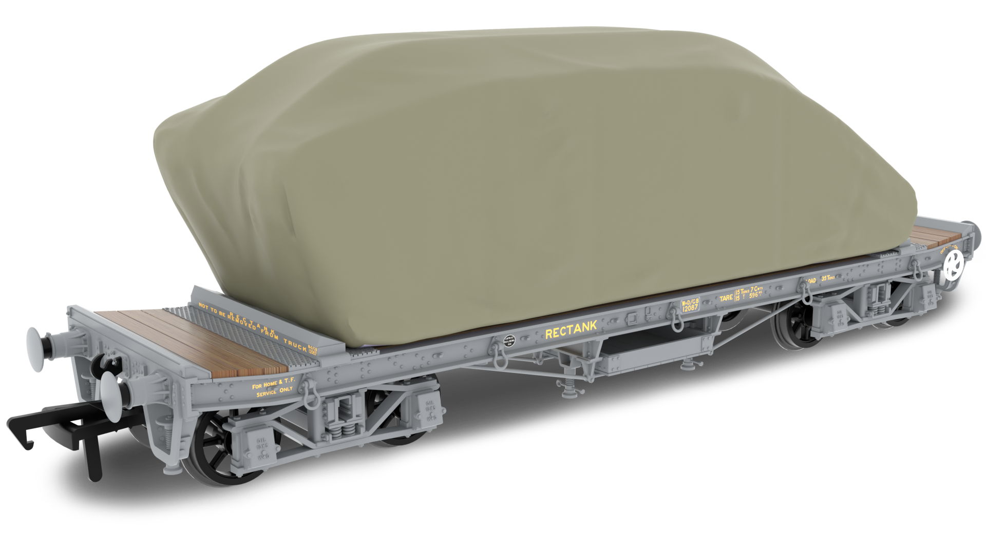 WD 35 Ton Rectank Bogie Flat WD Livery No. 12087 (L&Y Built) Tank Load End and centre Jacks Chain Boxes Chocks for loads in detail bag Spoke wheels running in pinpoint bearings High level of detail above and below the floor line High quality livery application NEM coupler pockets 1:76 scale, (OO gauge) UK designed