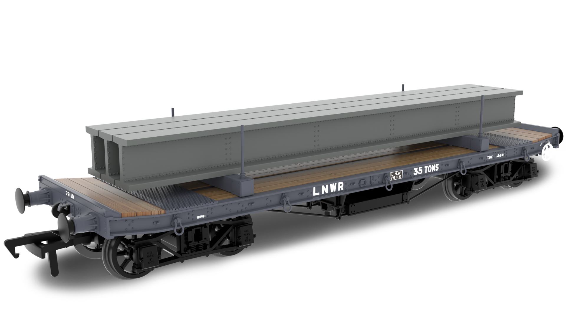 WD 35 Ton Rectank Bogie Flat LNWR Livery No. 79110 Girder Load Jacks removed Chain Boxes 2 Bolsters Spoke wheels running in pinpoint bearings High level of detail above and below the floor line High quality livery application NEM coupler pockets 1:76 scale, (OO gauge) UK designed