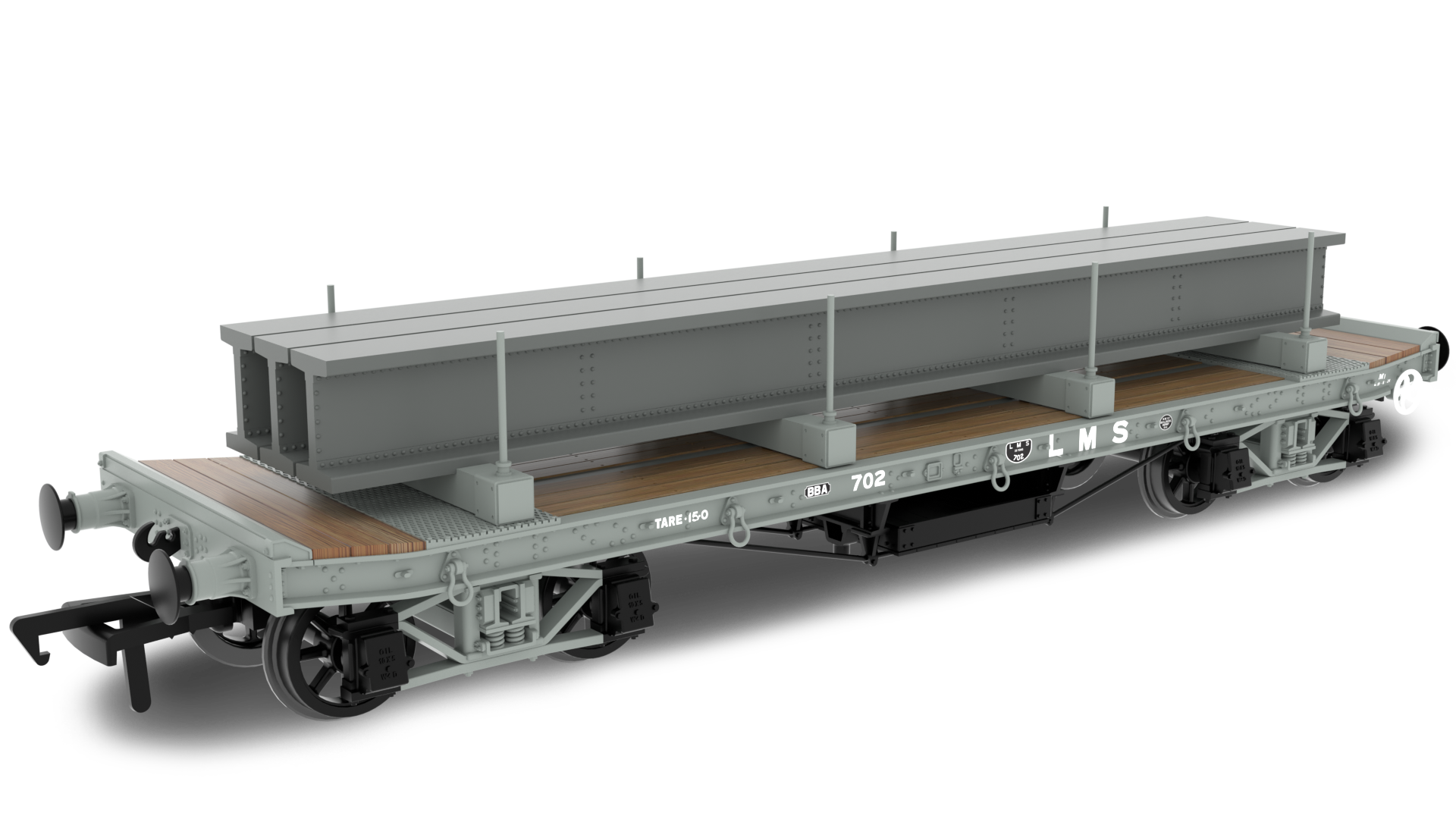 WD 35 Ton Rectank Bogie Flat LMS Grey (Pre-1936) No. 702 Girders Load Jacks removed Chain Boxes 4 Bolsters Spoke wheels running in pinpoint bearings High level of detail above and below the floor line High quality livery application NEM coupler pockets 1:76 scale, (OO gauge) UK designed