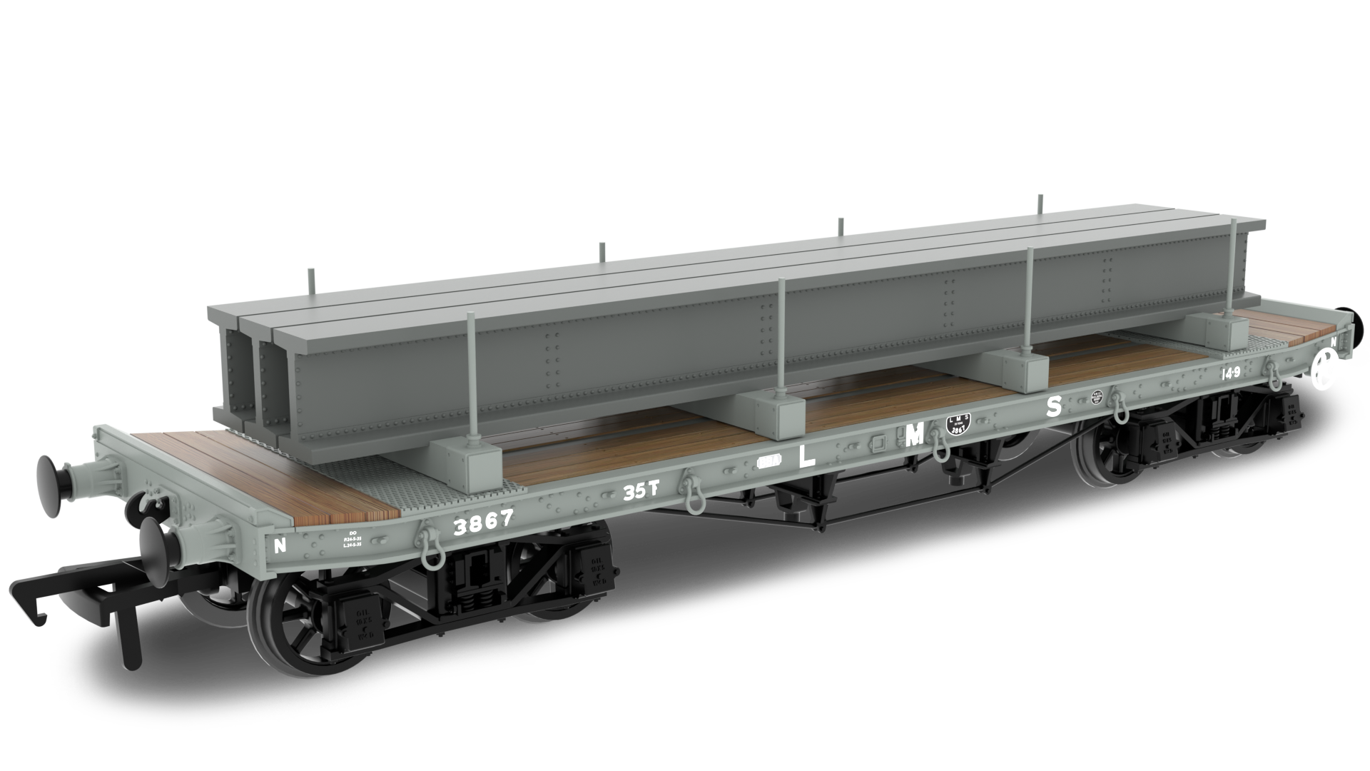 WD 35 Ton Rectank Bogie Flat LMS Grey (Pre-1936) No. 3867 Girders Load Jacks removed Chain Boxes removed 4 Bolsters Spoke wheels running in pinpoint bearings High level of detail above and below the floor line High quality livery application NEM coupler pockets 1:76 scale, (OO gauge) UK designed