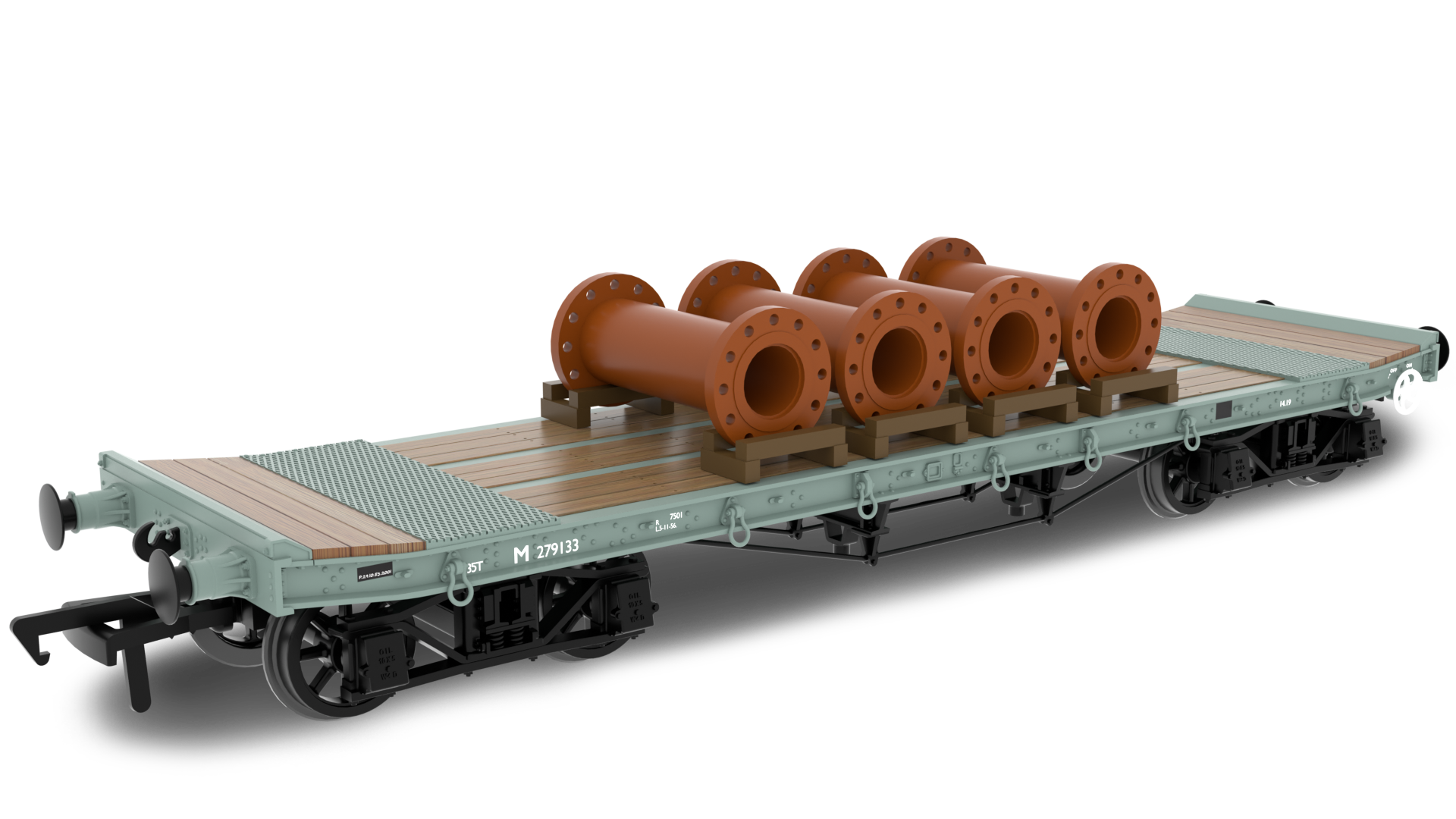 WD 35 Ton Rectank Bogie Flat BR Grey Livery No. M279133 Pipes Load Jacks removed Chain Boxes removed Extra Tie-downs fitted Spoke wheels running in pinpoint bearings High level of detail above and below the floor line High quality livery application NEM coupler pockets 1:76 scale, (OO gauge) UK designed