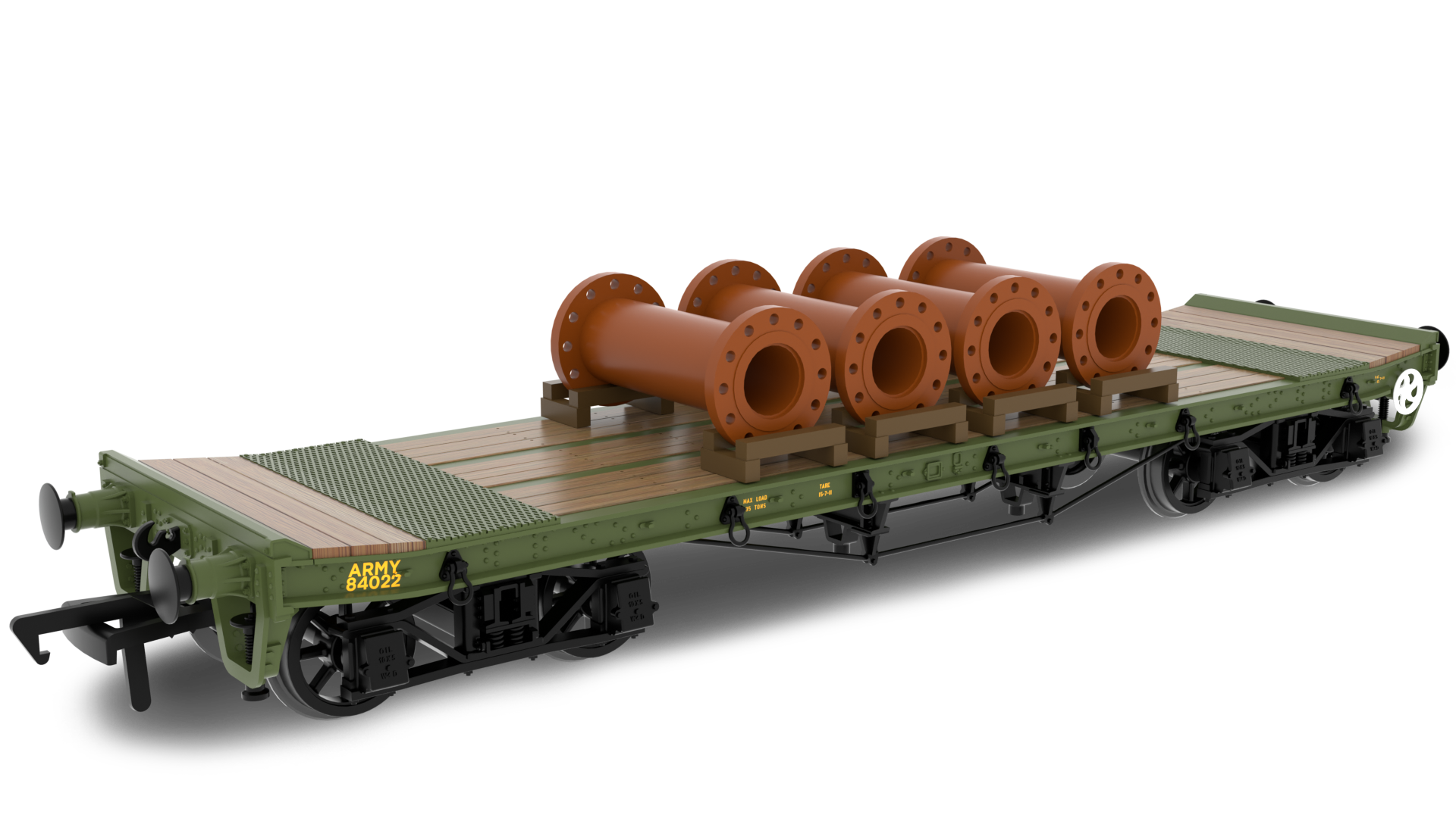 WD 35 Ton Rectank Bogie Flat Army Green Livery No. 84022 Pipe Load End Jacks fitted, centre Jacks removed Chain Boxes removed Extra Tie-downs fitted Spoke wheels running in pinpoint bearings High level of detail above and below the floor line High quality livery application NEM coupler pockets 1:76 scale, (OO gauge) UK designed
